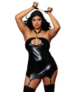 Dreamgirl Wetlook Corseted Back Halter-Neck Thong Teddy With Wrist Restraints Black O/S